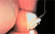 Seat the crown on a moistened prep. Remove excess acrylic with a scaler or explorer tip while the acrylic